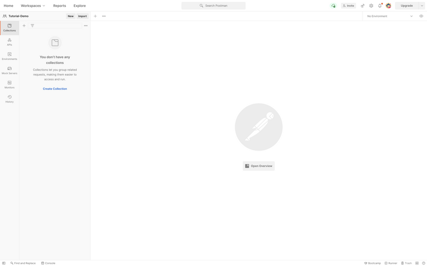 Open up the Postman app, and you will see that by default we will be at the Collections tab, and in this tutorial, that is where we will be at for the whole time.