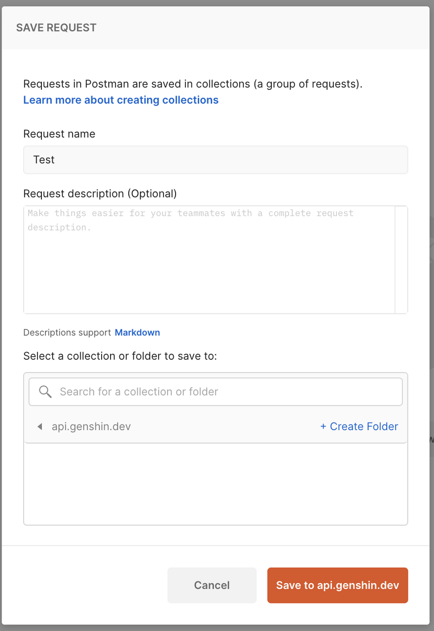Create a new request. Name it "Test" and add it to a new collection, say "api.genshin.dev", then click the Save button.