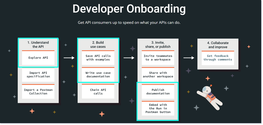 You can read here for specific use cases of Postman. In this tutorial series, what I'm essentially doing by teaching you Postman are parts of the use case of Developer Onboarding. The cyan highlighted parts are covered in this tutorial series, and I call it the **Lite* version*.