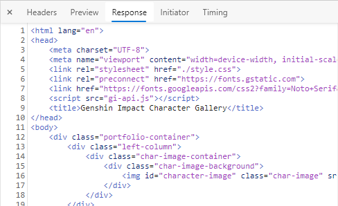 To improve your understanding of how you are getting different data whenever you are visiting different sites, we will compare the result of inspecting the network on 2 sites: api.genshin.dev & the completed demo.