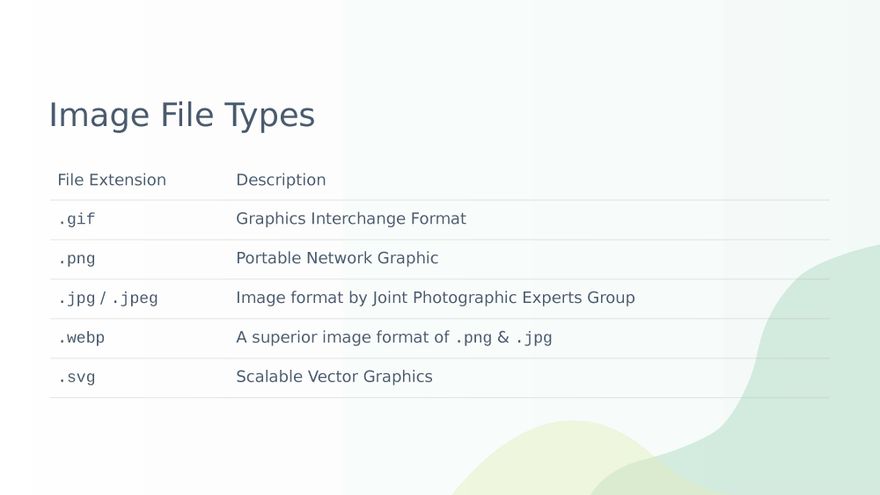 - For Raster Image File Types, there's 4 types - GIF, PNG, JPG and WEBP.