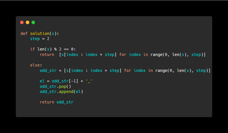 - Complete the solution so that it splits the string Into pairs of two characters.