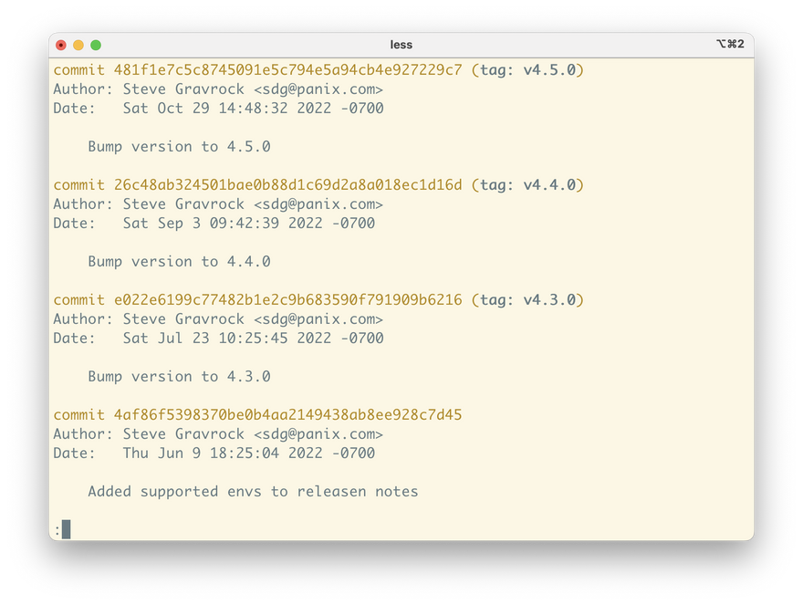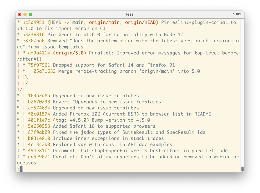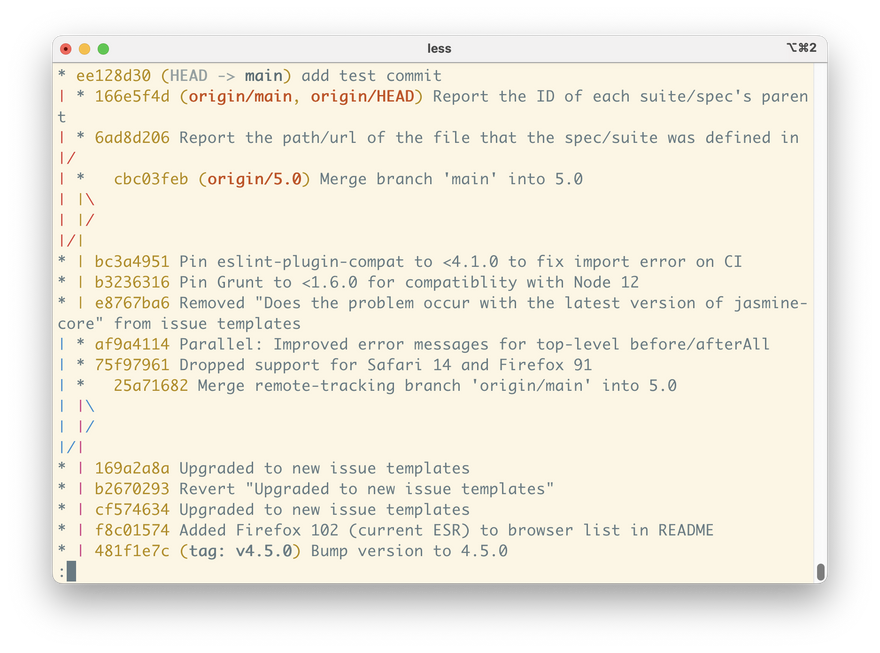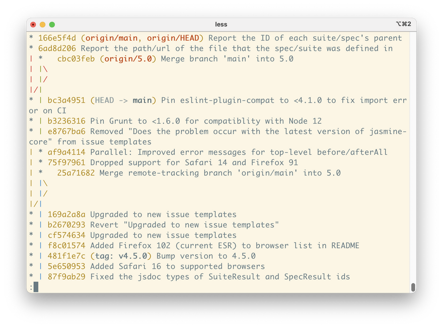The complete git tree output shows a lot of information. Sometimes your question is narrower, such as what has happened in the repository since a given point: branch, tag, or any other commit reference. For example, to see what has happened since the tag v4.5.0, we can run the following command: