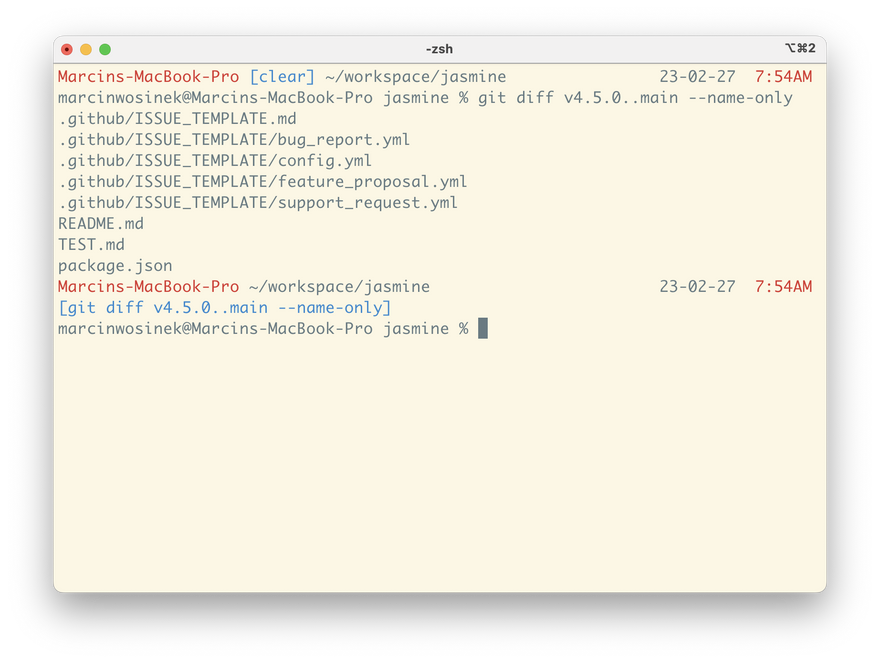 Another option we have to compare different points in the tree is to show all the code that changed between references. The basic command to see changes since v.4.5.0 until the current state of main would be: