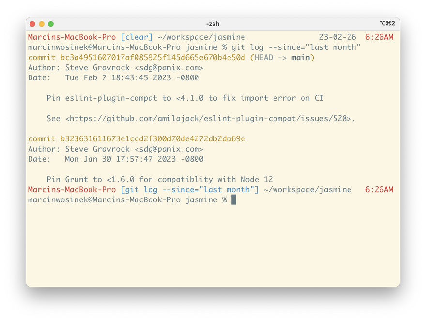 Another neat feature of git log is that it can filter the changes based on the time description. So, when I add --since=ālast monthā, it shows only the two most recent commits: