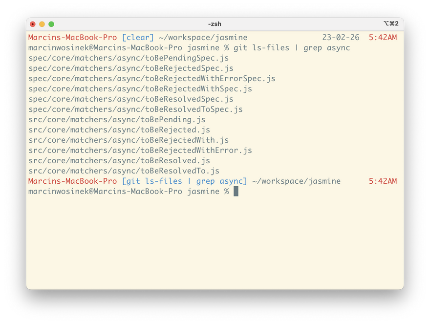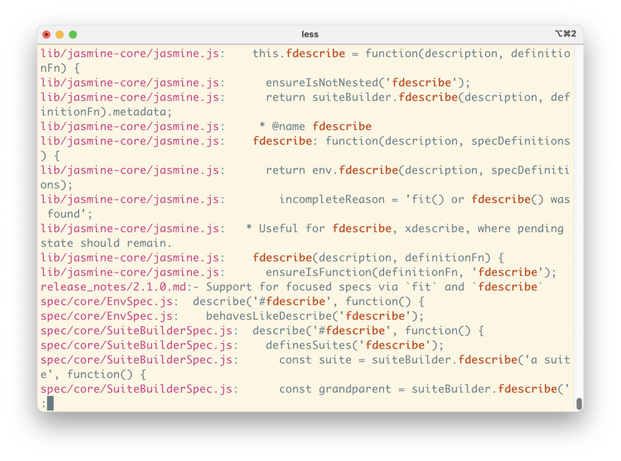 -A <number>and-B <number>to show lines after or before the matchāto provide you with more context. For example, forgit grep -A 3 -B 3 fdescribe, I get: