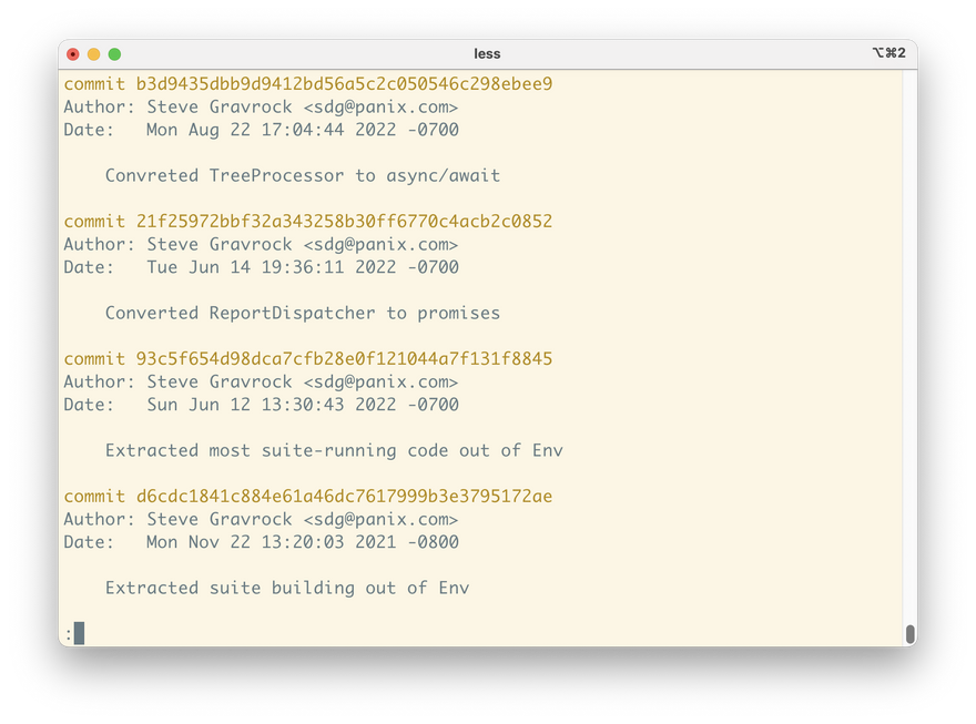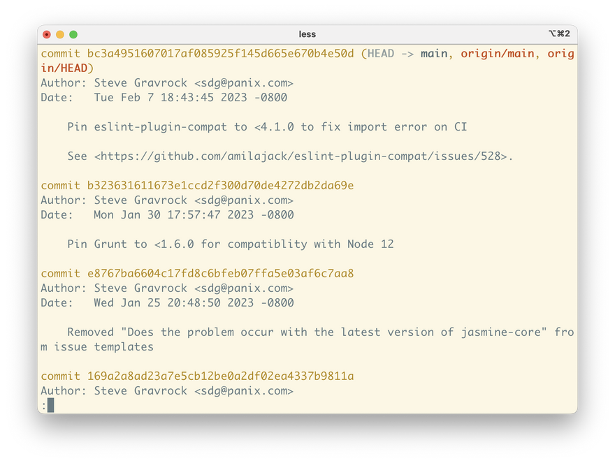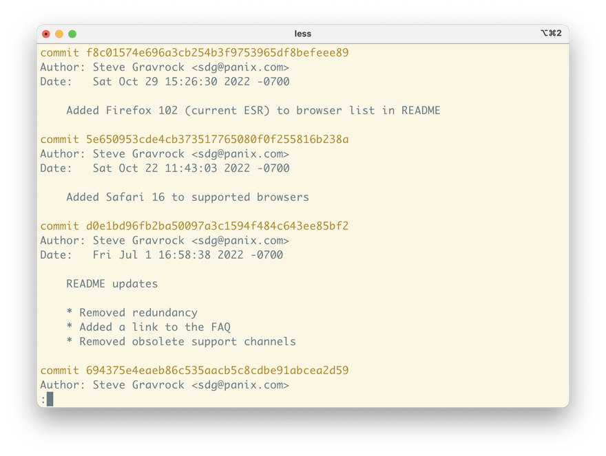 Note! As the output of this command is longer than my screen, Git shows it with a āpagerāāby default, less. A quick navigation summary is as follows: