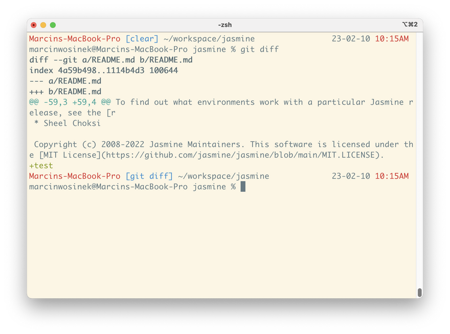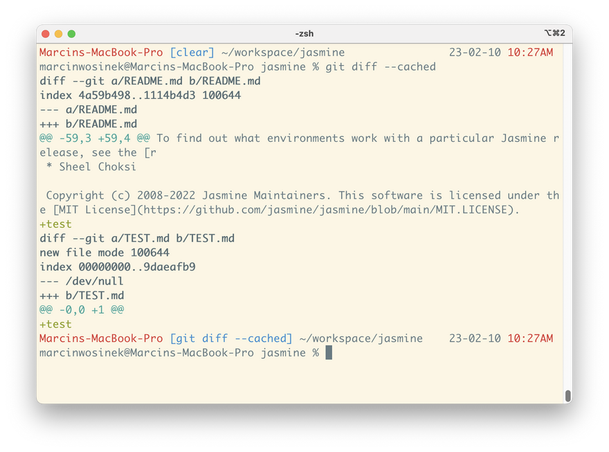 Note that itās only showing the changes to the file that is tracked by the repository. Our new file, TEST.md is ignored. When we add all the changes with git add ., the diff becomes empty: by default, it shows the difference between our working copy (files in the folder) and the staging (what is already added and ready to be committed). After adding everything, we can see all the changes that are staged with git diff --cached: