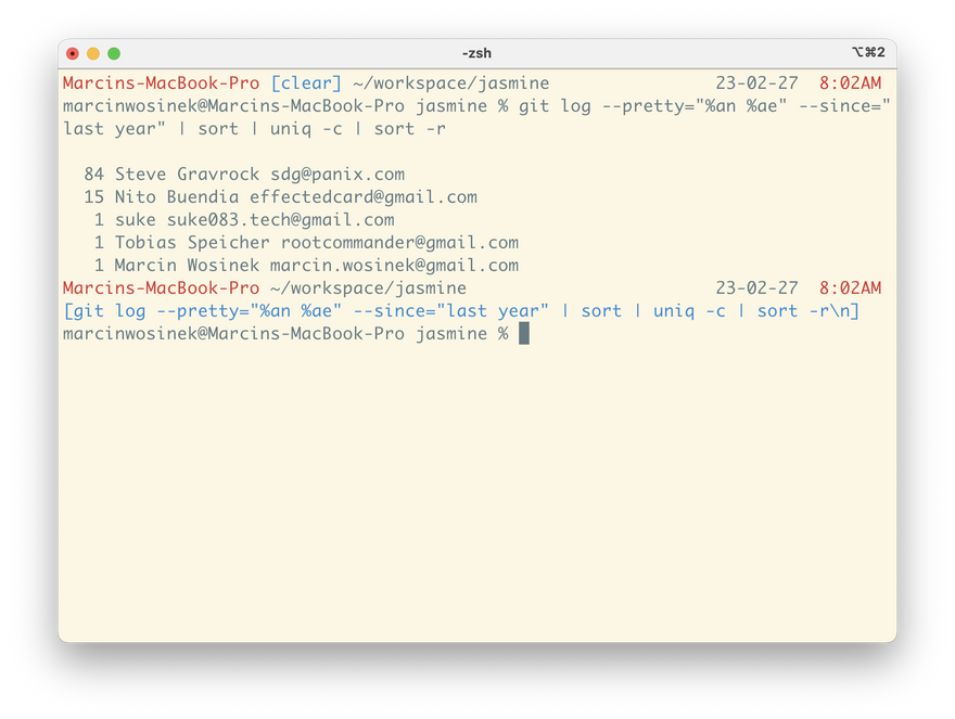 $ git log --pretty="%an %ae" --since="last year" | sort | uniq -c | sort -r