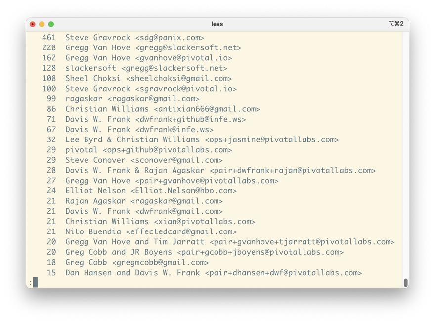 --pretty="%an %ae"ācustom formatting: we want the author's name & email -