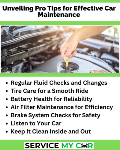 In conclusion, effective car maintenance involves a combination of proactive measures, regular checks, and a keen awareness of your vehicle's condition. By incorporating these pro tips into your routine, you not only ensure the longevity and reliability of your car but also enjoy a safer and more enjoyable driving experience. Regular maintenance is an investment that pays off in the form of fewer repairs, enhanced fuel efficiency, and a smoother ride for every mile ahead.