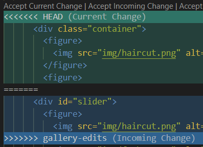 When I opened my code in VS Code, I saw conflict markers that Git placed around the conflicting code. The <<<<<<< HEAD marker indicates the branch I am currently on (the main branch), and the >>>>>>> gallery-edits marker indicates the conflicting commit coming from the topic branch.