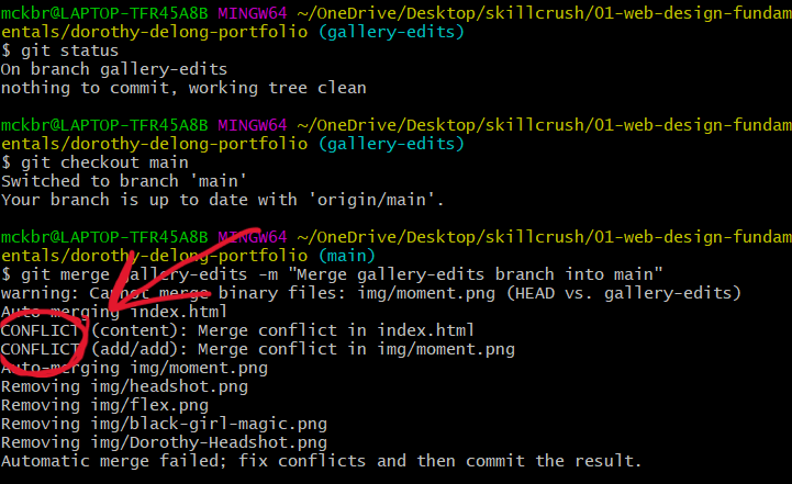 After adding (git add .) and committing (git commit -m "message") my final changes to the gallery-edits branch, I was finally ready to merge the gallery-edits branch with the main branch. Upon doing so in the command line, you can see that I received a merge conflict error: