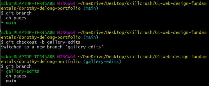 I didn't want to add errors to my existing code, so I created a new branch by typing git checkout -b gallery-edits in the command line.