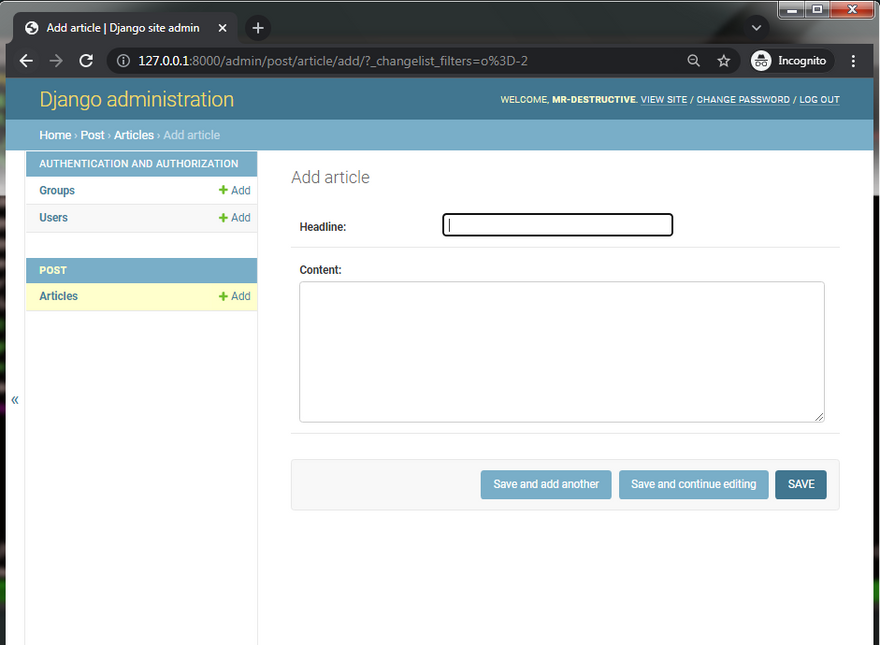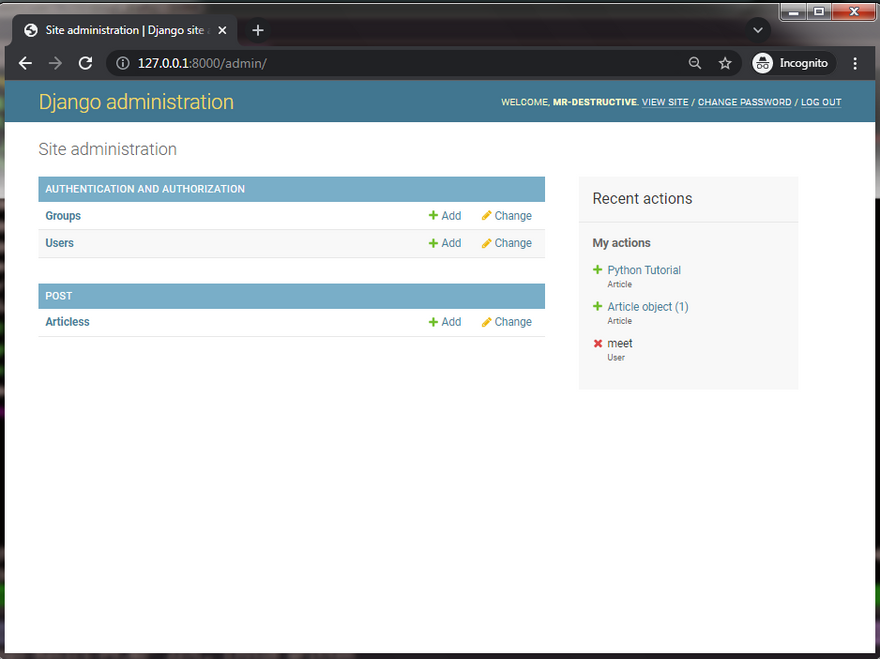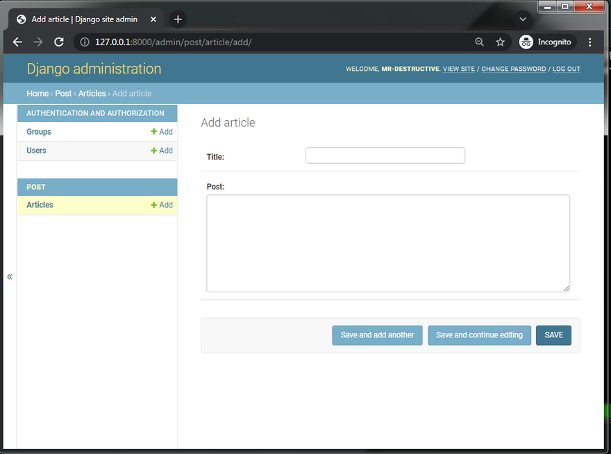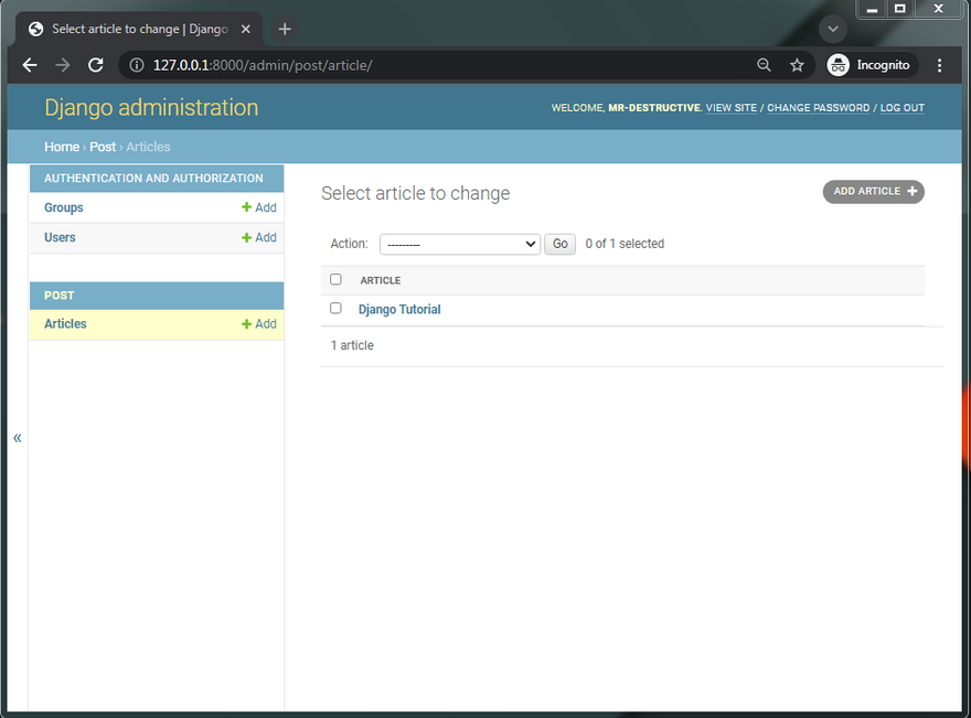 This will add the Model Article in the Admin Section. We can now perform CRUD operations in the Admin section.