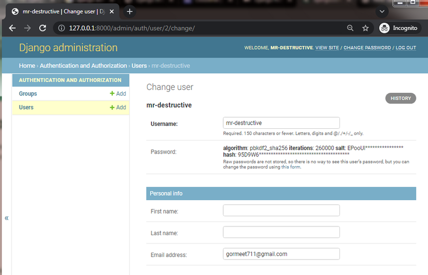 But there is no option for the Email-ID that's because for the User model has been modifies from the base User Model and we can see the superuser has all the attributes the User class has like the email, first name, last name and so on.
