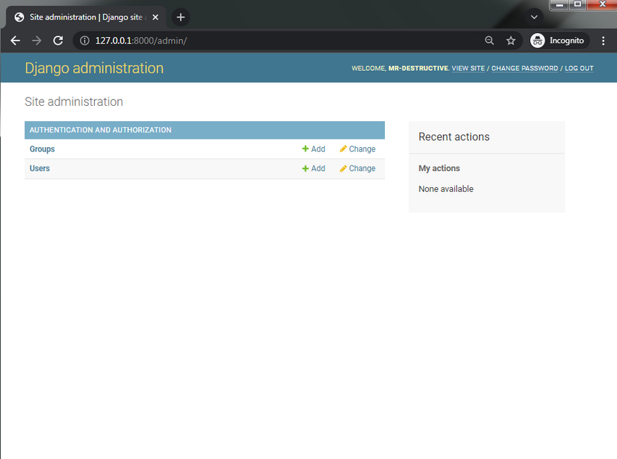 The Admin interface looks quite simple but is quite powerful and customizable. We have the Default Models in Django which are labelled in the Authentication and Authorization section namely the Users and Groups. You can see we have + Add and the Change links to actually create the data associated with those Models. In the Admin Section you can basically play around with your models, it was not designed to act as the frontend for your application that's what the Django documentation says and is absolutely correct.