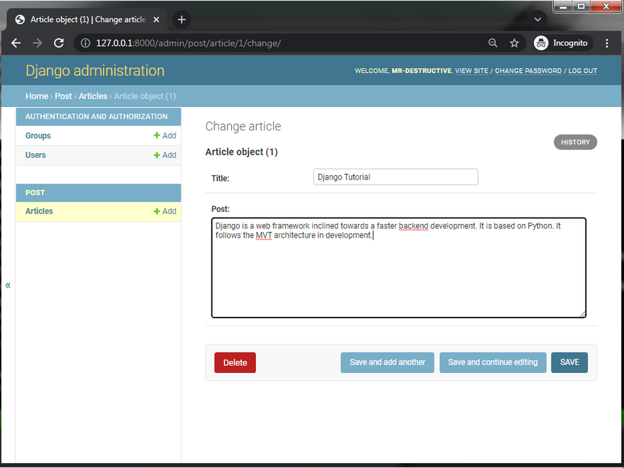 Now, we can see we also have the ability to Delete and Update the Post. This is the best thing about the Django admin interface. It's quite intuitive for complex model to be tested before moving ahead and making necessary corrections if required.