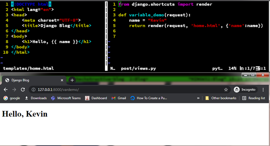 As we can see the variable in views is passed as a dictionary in python. The reference key along with a value of the variable as the name of the variable. We will use the key in the templates to parse the value of the variable.