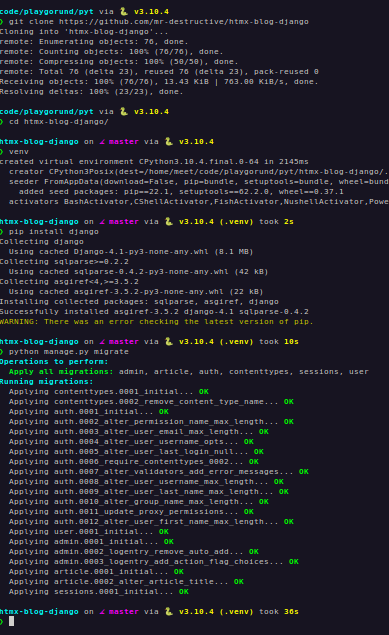 To set up a django project, we can run the following commands to quickly get up and running with a base django project.