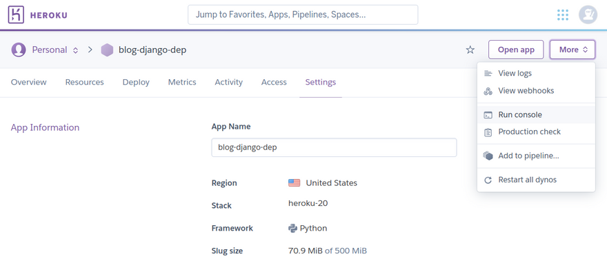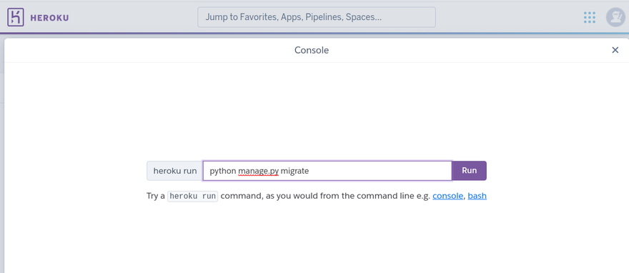 If you don't have heroku CLI set up and want to fix a few things on the pushed code to the heroku app, you can use the Run Console option from the More Tab on the top right corner of theApplication dashboard. This is a great way to run migrations, configure static files or tweak a few things here and there without messing up the code on GitHub or the remote git repositories.