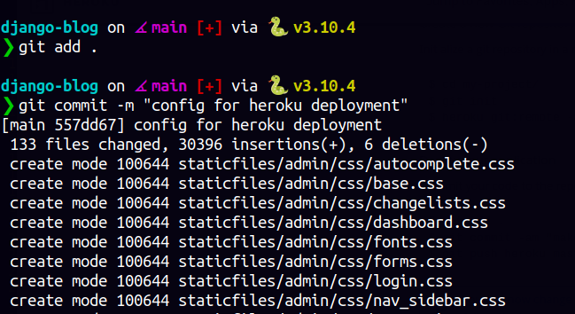 So, this command will collect all the static files and store them in a single place. We see that the files from the admin section are also copied as well as the custom static files from the project configuration. Now, we can move on to set the config variable for the heroku app.