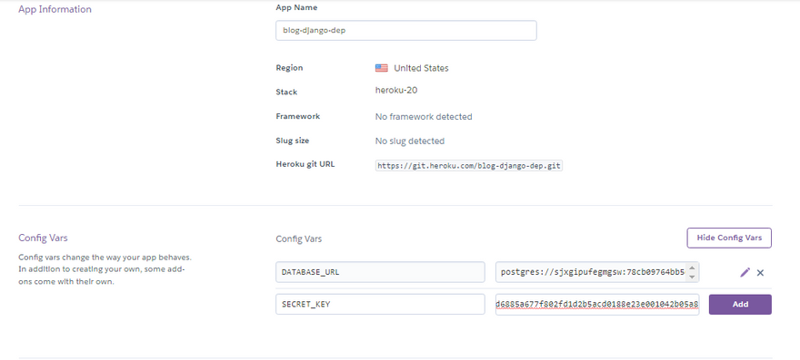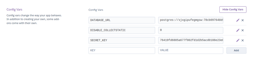 Now, if you have some static files like CSS, Javascript, or images, you need to configure the staticfiles in order to serve them from the heroku server. We will require another config variable for collecting the static files from the selected repository.