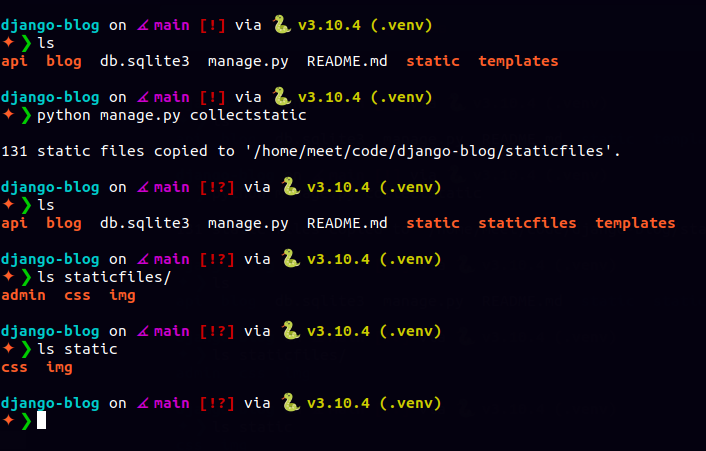 Here, if you have served your static files from the static folder in the root directory of your django project, you can add the above code in the settings.py file. We will collect all static files in the folder along with the default static files provided by django in the staticfiles directory. Run the following command if you want to test whether the static files are properly collected and served.