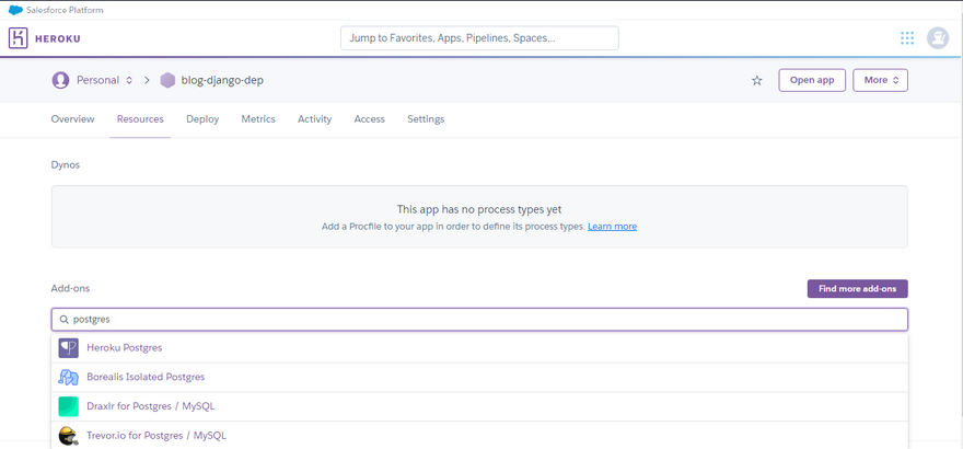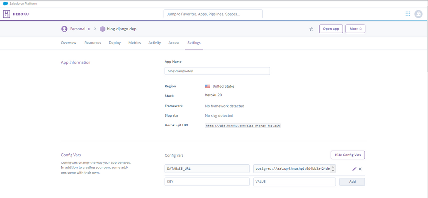 This should hopefully add a fresh instance of a postgres database for your heroku app. You can now configure the database for your project, we simply need the Database URL from the heroku app dashboard. We'll see how to configure the environment variables in Django for Heroku to keep your secrets like the SECRET_KEY, DATABSE_URL, etc.