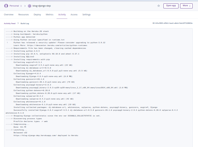 This will prompt you for your GitHub credentials and will deploy the commits to the remote repository on GitHub. This push on the main branch should also trigger the build process of the heroku app for this django project. You can navigate to the Activity section for the Build logs.