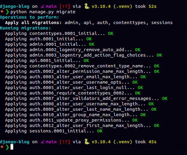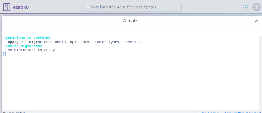Now, that we have configured the database, we can now apply migrations to the fresh database of postgres provided by heroku. We will simply run the migrate command and in the heroku app the PostgreSQL database would have been modified and an appropriate schema should be applied.