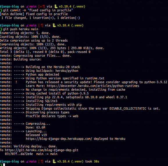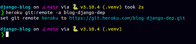 Here, heroku is the remote repository location and main is the branch of the repository. This will push the code to the repository and thereafter create a build to deploy the Django project as a Heroku application.