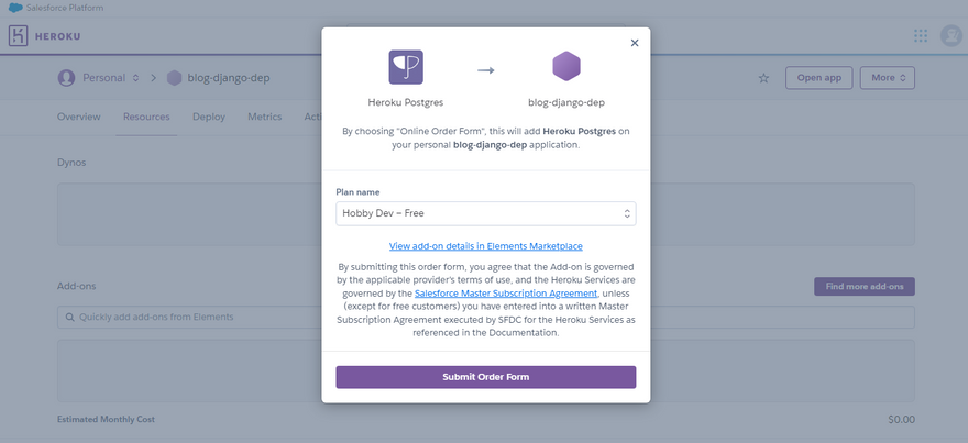 Heroku PostgresAdd-on - Submit the Order Form and you have the add-on enabled in the app.