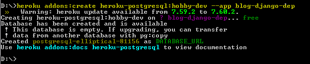 This will allow us to work with heroku commands and manage our heroku application from the command line itself. The below command will create a add-on for heroku-postgres for the application provided as the parameter options