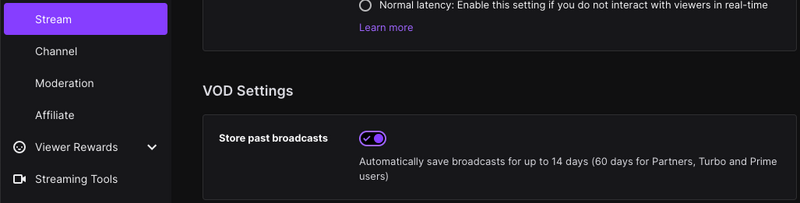 - If you plan on uploading your streams to YouTube or want to create clips later, ensure that you have Store past broadcasts on in your stream settings