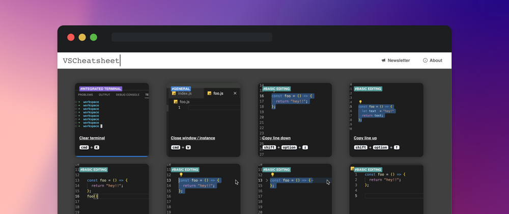 To overcome this, I have created VSCheatsheet which uses .gifs to illustrate the function of each shortcut. Each illustration, shows in a simple and straight-forward manner the effect of pressing a particular shortcut.