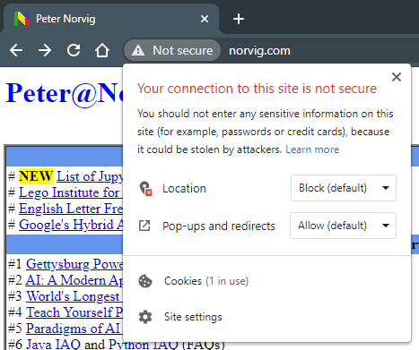 Sure enough, no green padlock here! In fact, Google Chrome even displays a very prominent âNot secureâ notice informing you and reminding you to not enter any sensitive info (credit cards, passwords, etc) on Peterâs webpage.