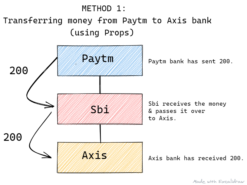 Explanation: Remember the Parent-Child example I explained from above ? And how I explained the whole dealing with the 'prop', 'destructuring' etc ? Here is the exact same thing we are doing. Here, Sbi extracts the prop passed from Paytm and then passes it as the props to its child element (Axis).If you havn't understood this part, don't worry, just go through the Parent-Child example.