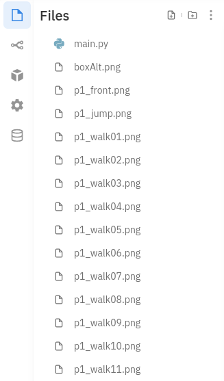 Before we start writing code, we're going to need a few sprites, which we've made available here. Extract this ZIP file and add the files inside to your repl using the upload file function. You can select multiple files to upload at once. Your repl's file pane should now look like this: