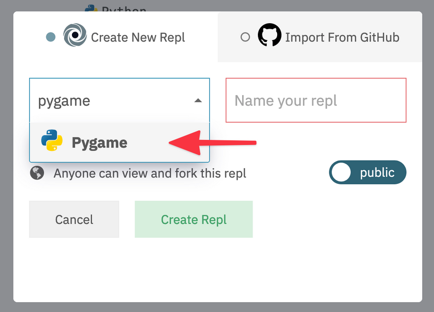 Create a new repl and select "PyGame" from the language dropdown.