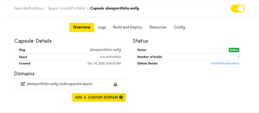 Your Capsule is now building. This process will make your portfolio visible online. After it has deployed, click the "Overview" tab, then press the link under "Domains" to view your portfolio.