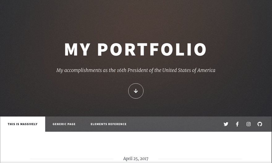 The default layout for Massively is designed for a blog or news website containing articles. To look like a portfolio, we should delete the dates above each article entry. Do so by locating and deleting all lines beginning with <span class="date"...>.