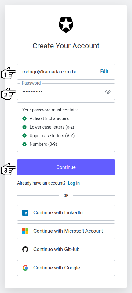 3. Fill in the fields Email Address, Password and click on the button Continue.