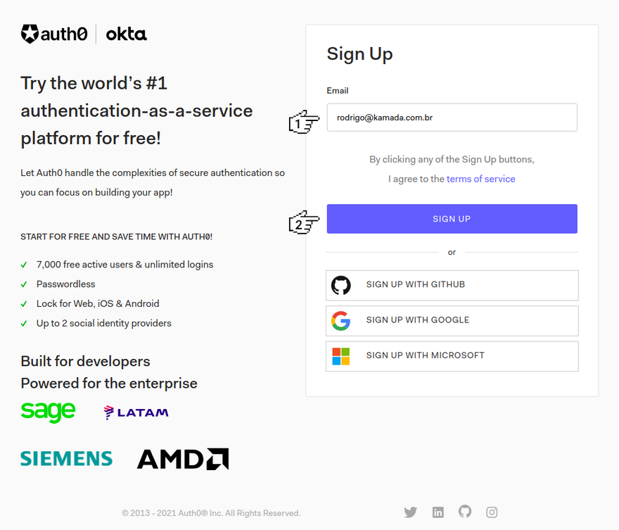 1. Let's create the account. Access the site https://auth0.com/ and click on the button Sign up.