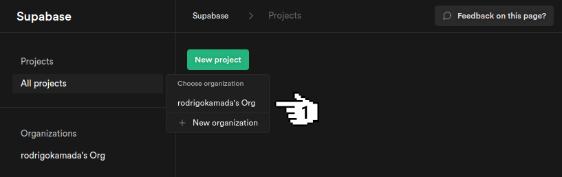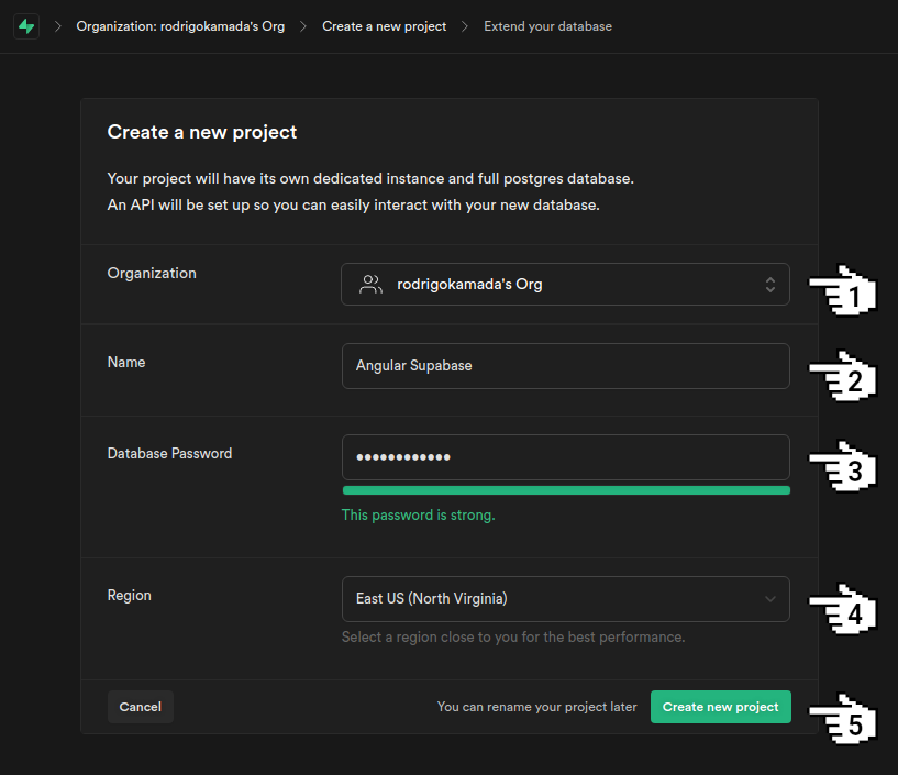 7. Select an Organization, fill in the fields Name and Database Password, select a Region and click on the button Create new project.