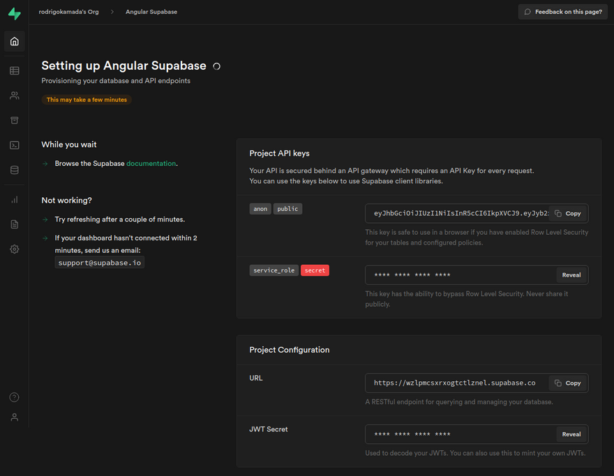 9. Click on the button Copy to copy the key that has been generated, in my case, the key eyJhbGciOiJIUzI1NiIsInR5cCI6IkpXVCJ9.eyJyb2xlIjoiYW5vbiIsImlhdCI6MTYzNTA4NjA1MCwiZXhwIjoxOTUwNjYyMDUwfQ.CzFuYS6XKvEwW5OsAAPAcHvuo-NVE4PUwDSKgqK9Yas was copied and click on the button Copy to copy the URL that has been generated, in my case, the URL https://wzlpmcsxrxogtctlznel.supabase.co was copied becouse this key and URL will be configured in the Angular application.
