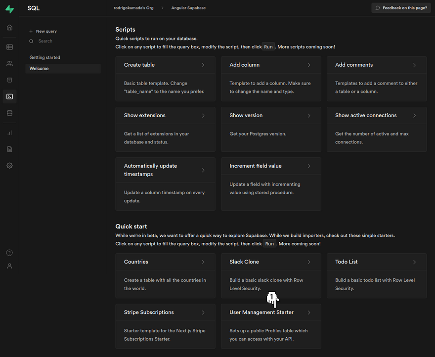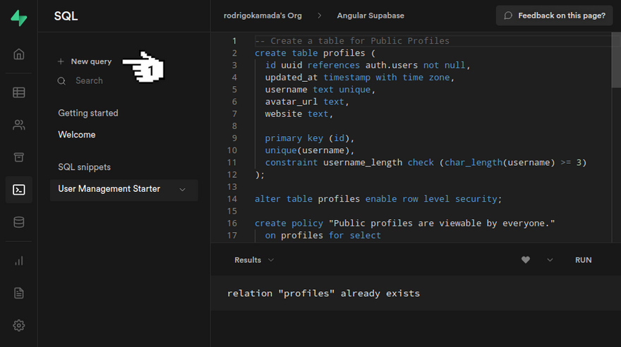 5. Go back to the Supabase site and click on the menu New query.