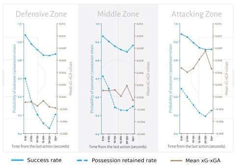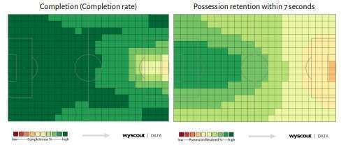 The values in hexagons on the slice ranging from 0 to 100 denote their percentage. As for throw-in sonars, there is no principal difference between each zone. Throw-ins directed toward the opposition’s goal are less likely to be completed or retained.