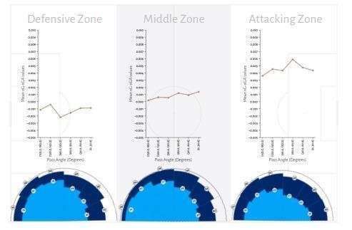 Next, we consider the throw-in angle. Throwing sonars are extra components to the figure shown below rather than line plots like in the preceding probability chart above. Each pizza slice represents a bin. The sequence of the bins begins on the left with the bin with an angle of 180-150 degrees and progresses in steps of 30º, as shown in the line plot below. The dark blue pizza slice reflects the completion rate of the bin’s throw-in in the zone, whereas the light blue slice indicates the possession retention rate.