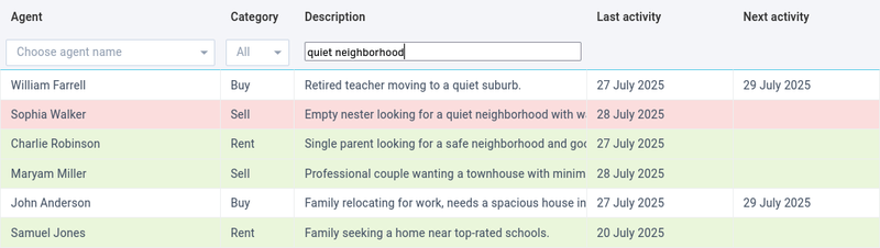 Example: Query "quiet neighborhood" triggers matches for:"Retired teacher moving to a quiet suburb" (84% match)"Empty nester looking for a quiet neighborhood with walking trails" (77% match)"Single parent looking for a safe neighborhood and good schools" (76% match)